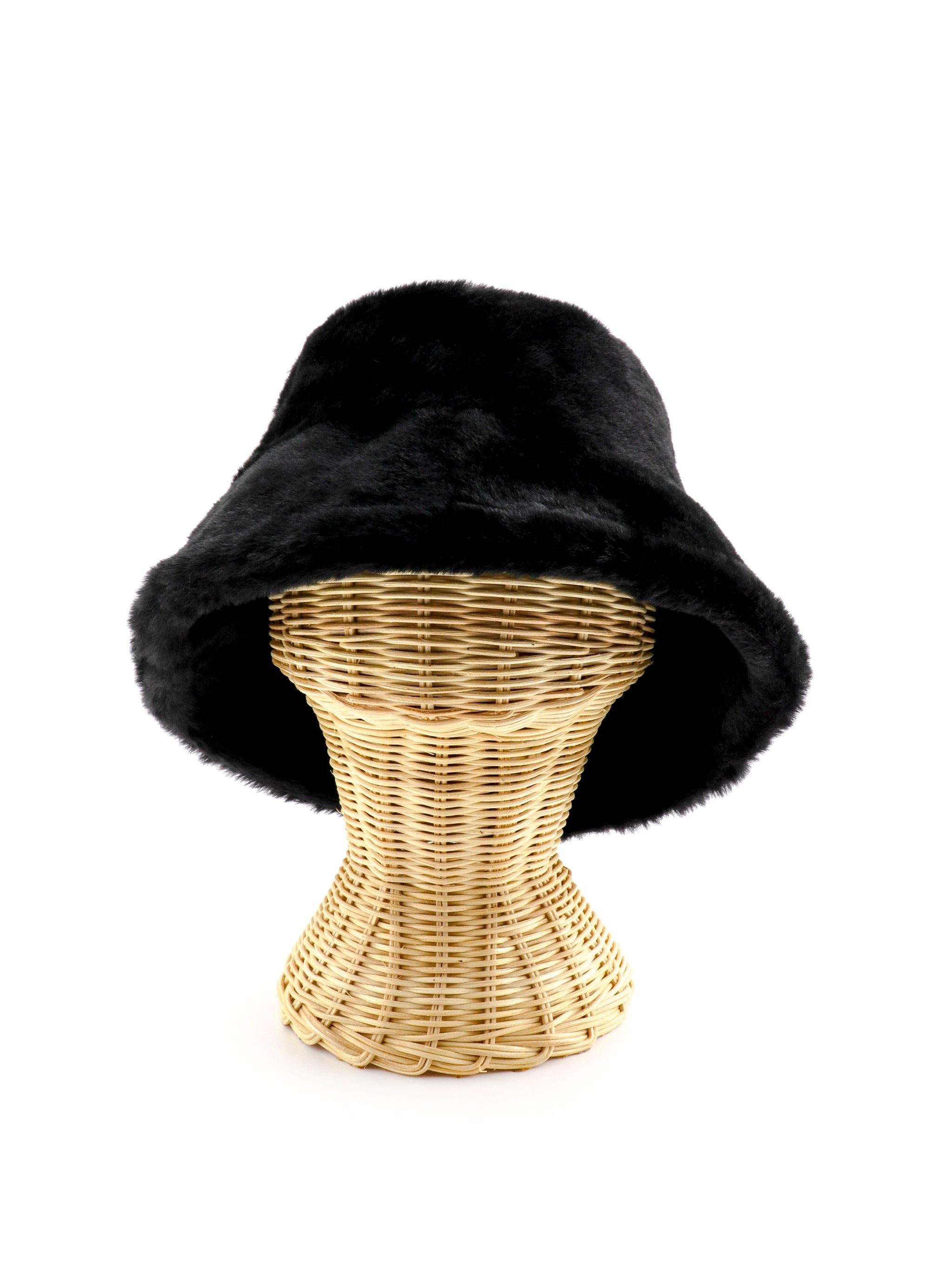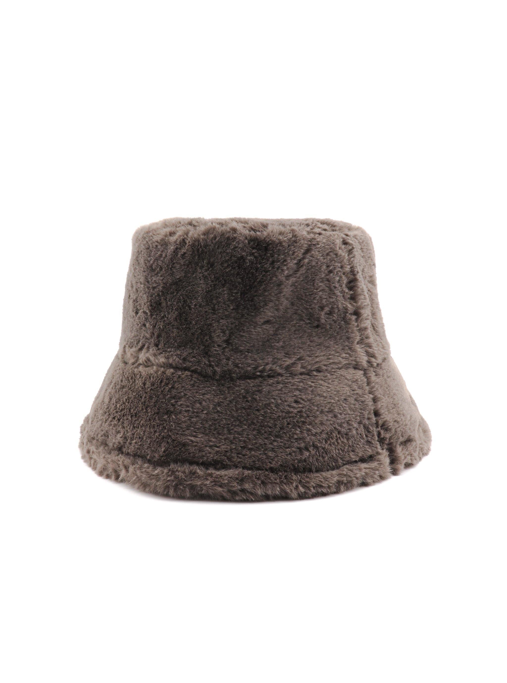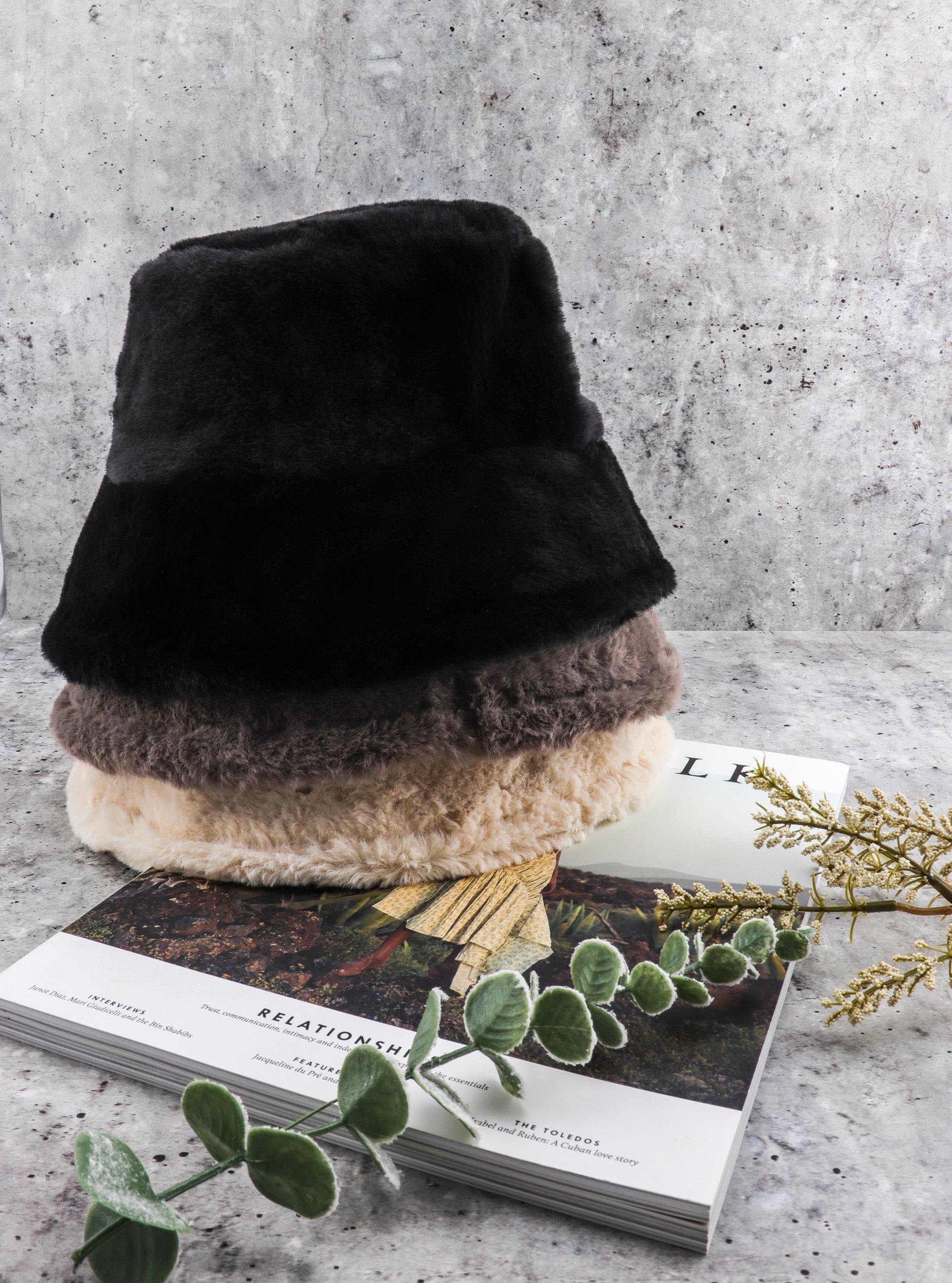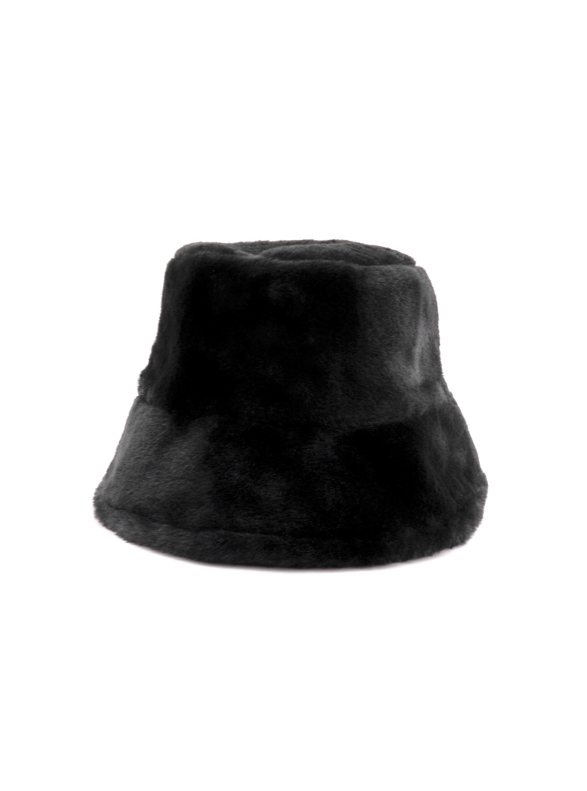 Soft and plush, slightly oversized, faux fur bucket hat. Luxe textured finish gives off a cozy and glamorous complement to warm up any winter styling.